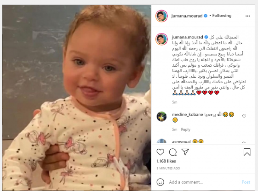 توفيت ابنة الفنانة جومانا مراد، حيث نشرت صورتها على حسابها الشخصى بموقع تبادل الصور والفيديوهات “انستجرام” وعلقت قائلة: “الحمد لله على كل حال، لله ما أعطى ولله ما أخذ، وإنا لله وإنا إليه راجعون، انتقلت إلى رحمة الله اليوم ابنتنا ديانا ربيع بسيسو”.